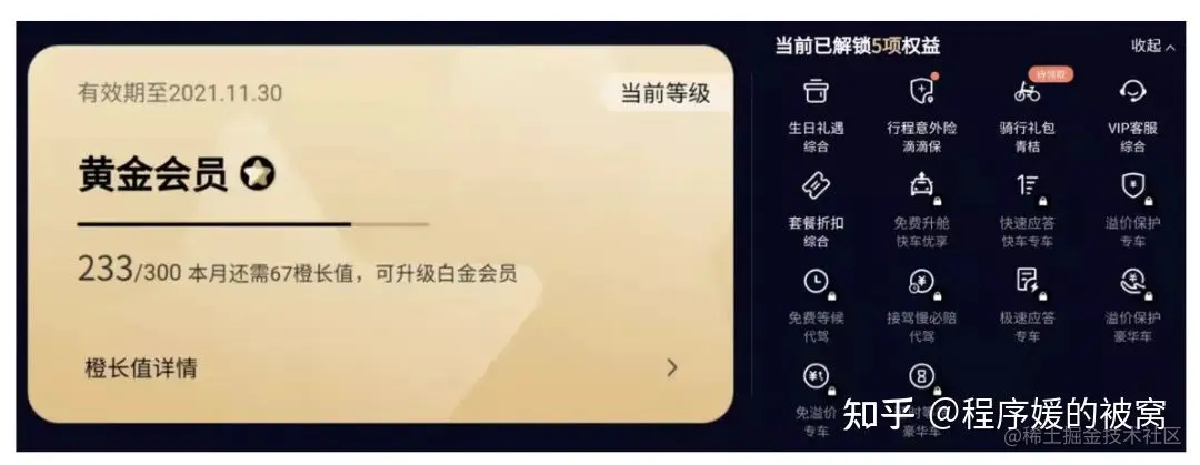 滴滴会员是π酱做调研分析的时候看到的,自己没有申请过,是一种根据积分划分的权益等级,基本就是注册了之后就根据使用统计开始进行积分和权益的发放。从会员权益可以看到,除了滴滴出行之外的权益,还包括了滴滴骑行相关的礼包,之前还看到有橙心优选相关的优惠。