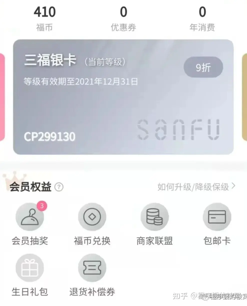 三福百货,一家经营男女休闲服装,精饰品、化妆品、内衣、鞋帽、箱包、家居的公司。主要的会员权益如下,主打等级折扣,也就是随着累计消费额度的上升,折扣力度越来越大,此外比较友好的就是生日礼包了。其中商家联盟应该是作为辅助的引流入口,这里送的是喜马拉雅的充值券。根据π酱这么多年的使用来看,最主要的功能还是打折功能,线上和线下通用的,其他绑定权益都比较鸡肋。