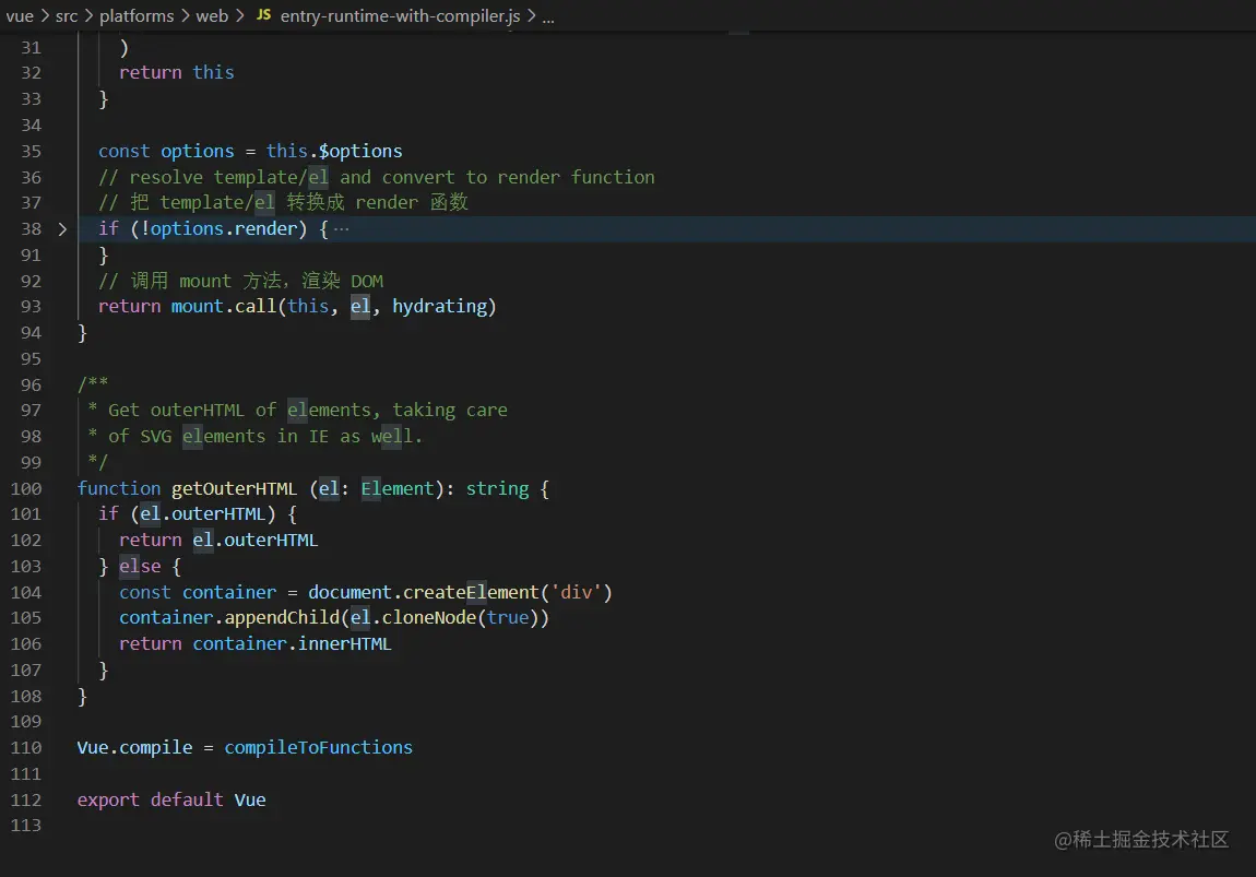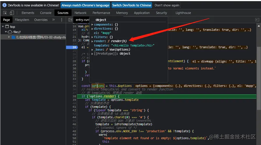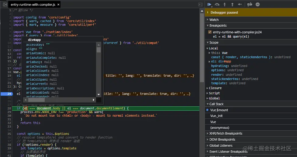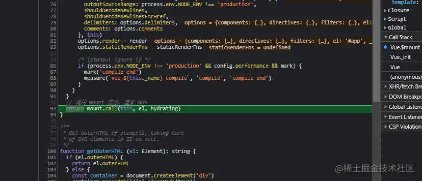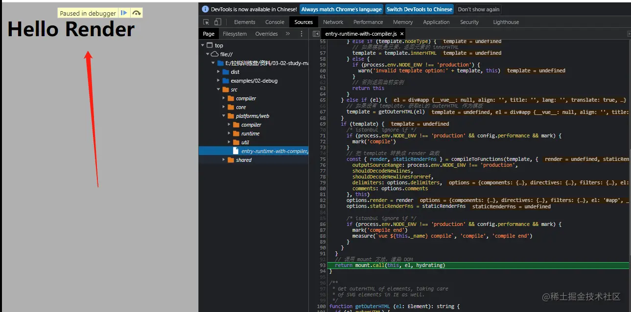 运行到浏览器打开控制台,打开代码地图,找到src下platform/web 中的 entry-runtime-with-compiler.js 打断点