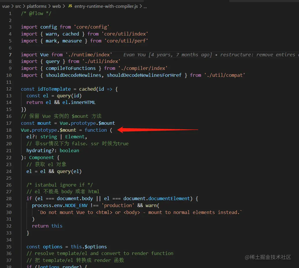 new Vue的时候有传入 render ,故而 if 判断不成立,直接执行mount函数挂载 DOM