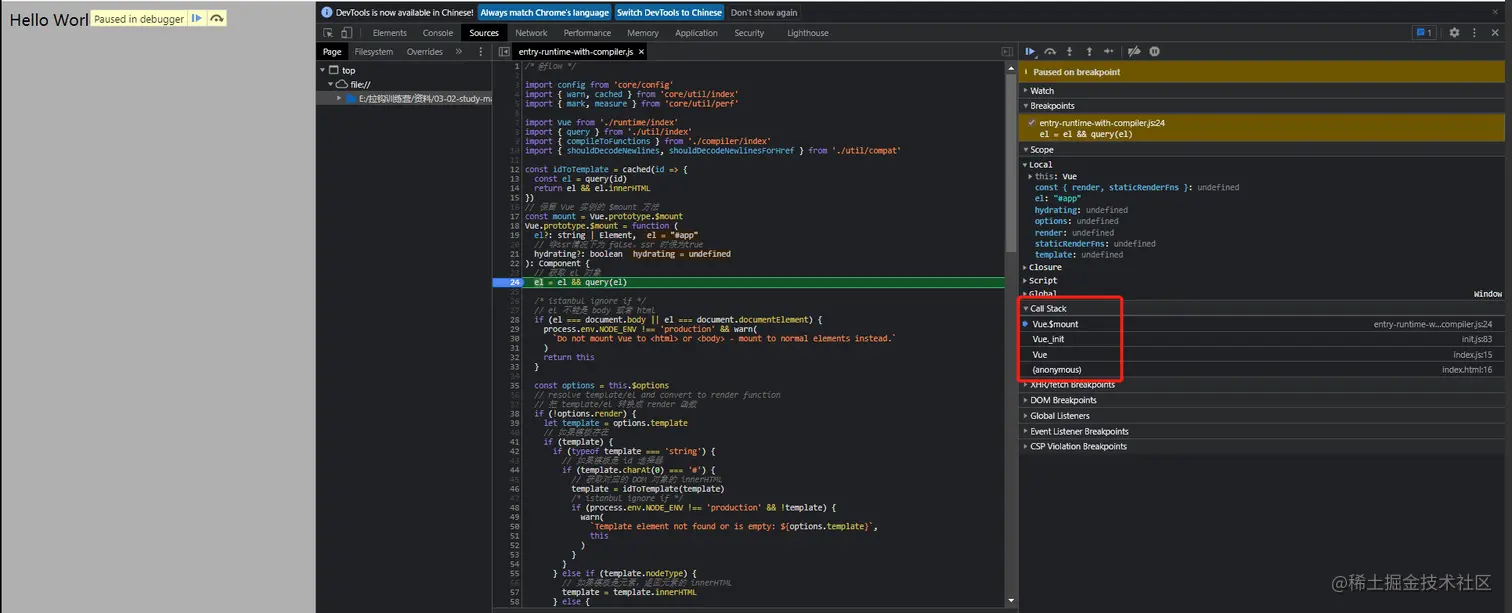 Call Stack 中可以看到,$mount 在vue的 _init 函数中被调用,_init 函数 在Vue 的构造函数中被调用, 构造函数在 new Vue实例的时候触发。