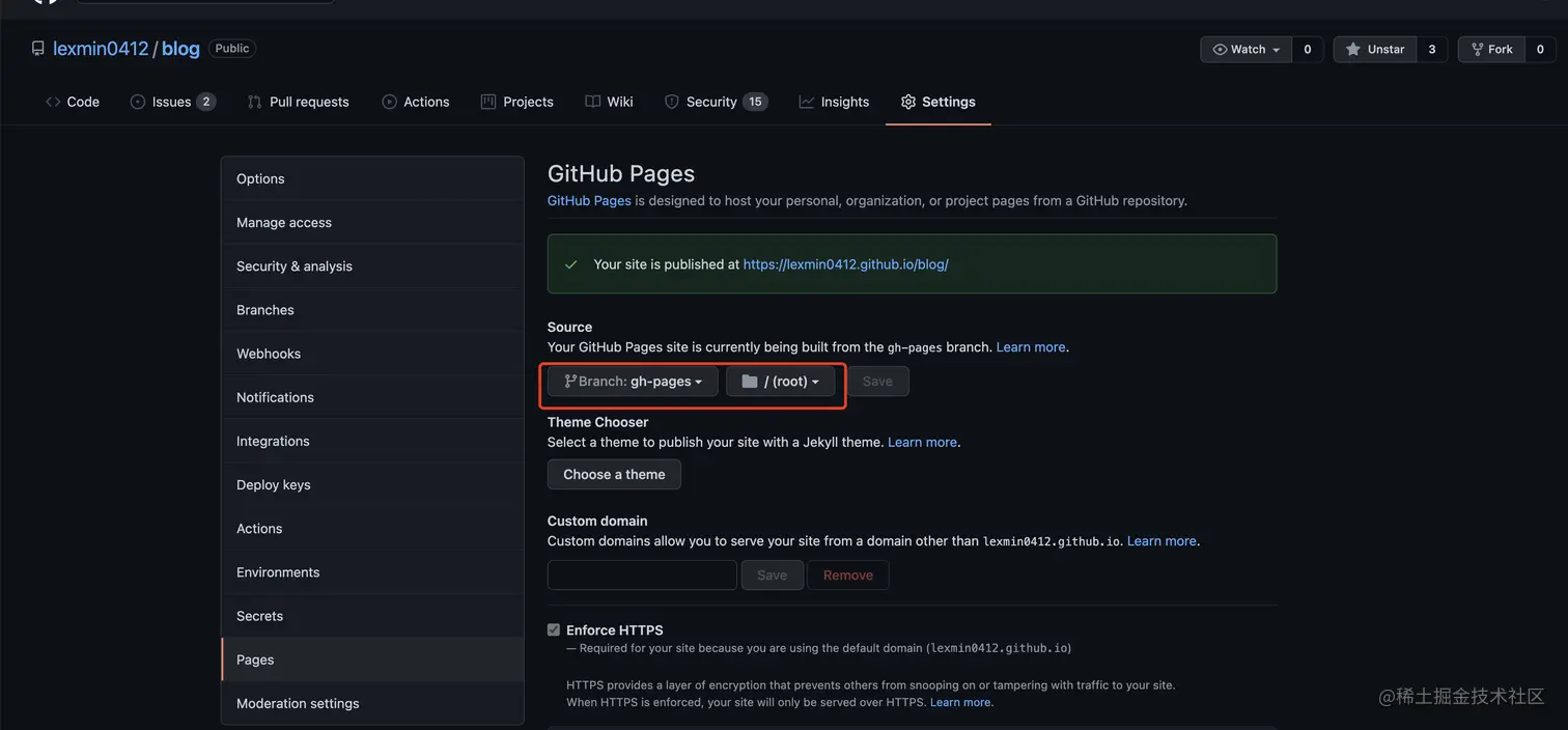 当complete job选项完成的时候,进入仓库的 Settings => Pages 菜单下,将 source Branch 字段设置为 gh-pages,文件夹选择 root 根目录就好: