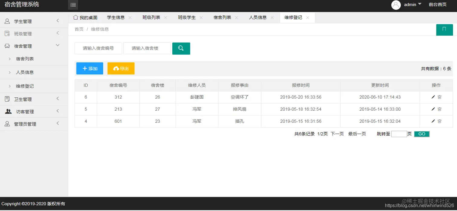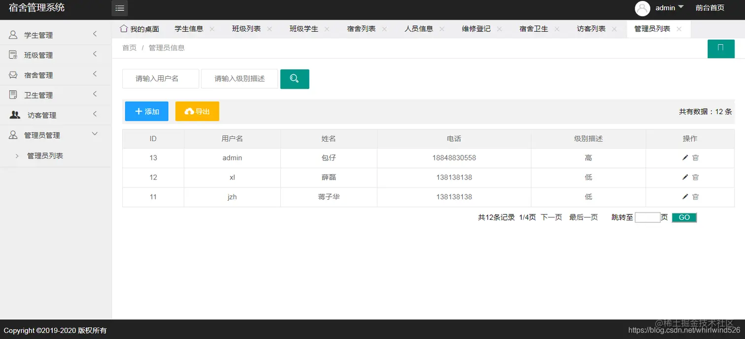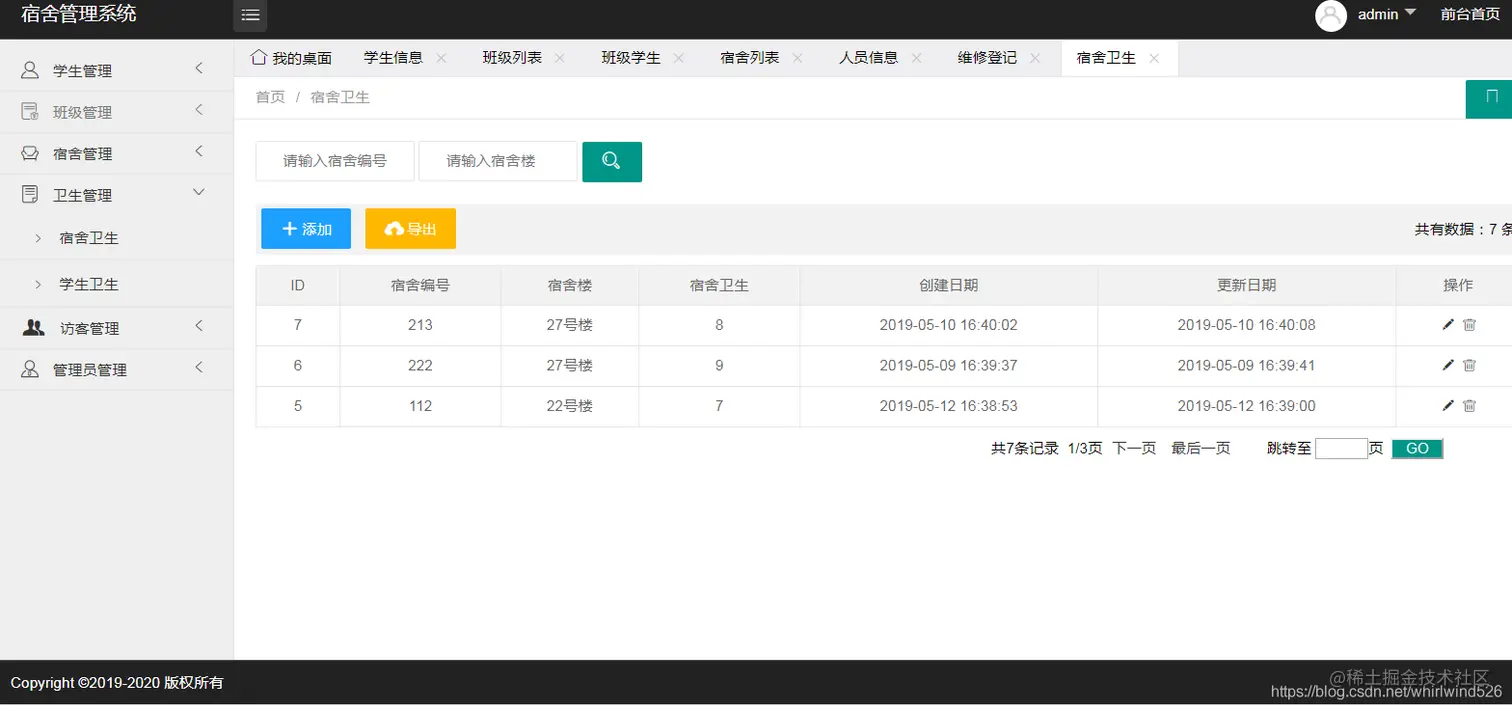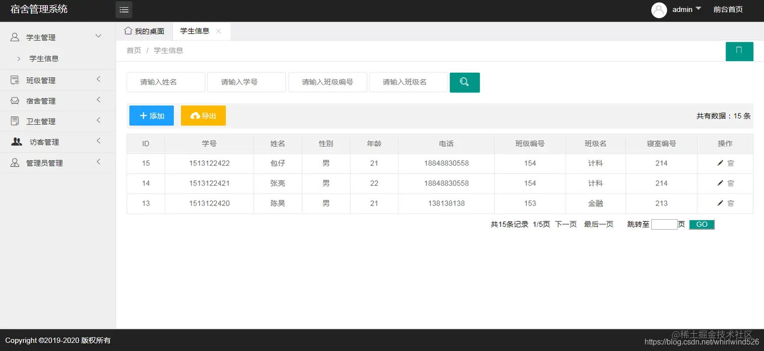 基于SSM实现学校宿舍管理系统:主要包含学生管理、宿舍管理、班级管理、宿舍卫生管理、访客管理、收费管理、管理员管理等功能。并能导出各模块数据到EXCEL表中。
