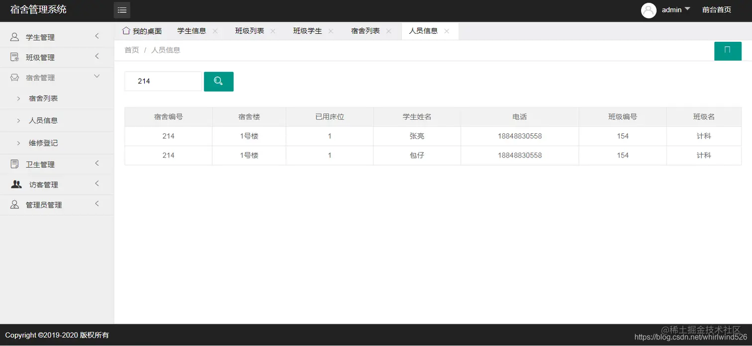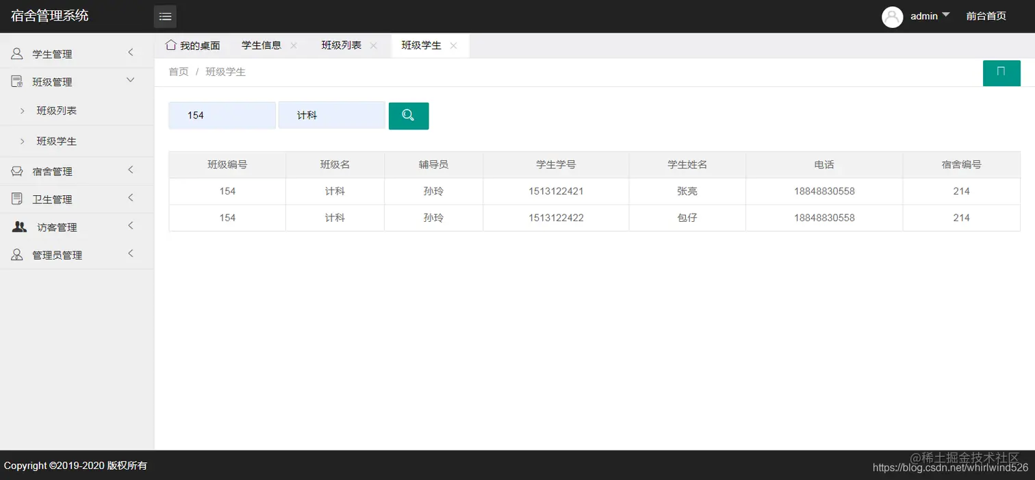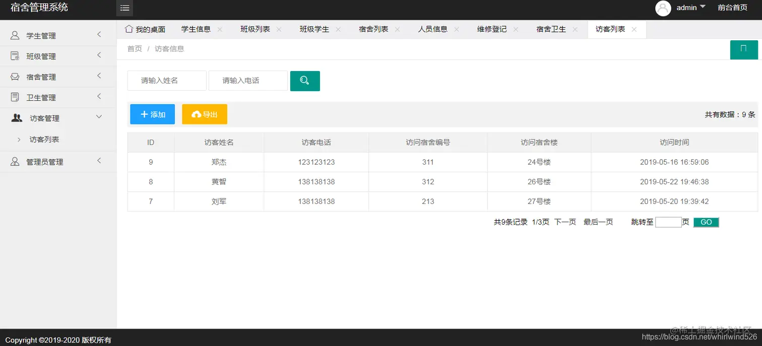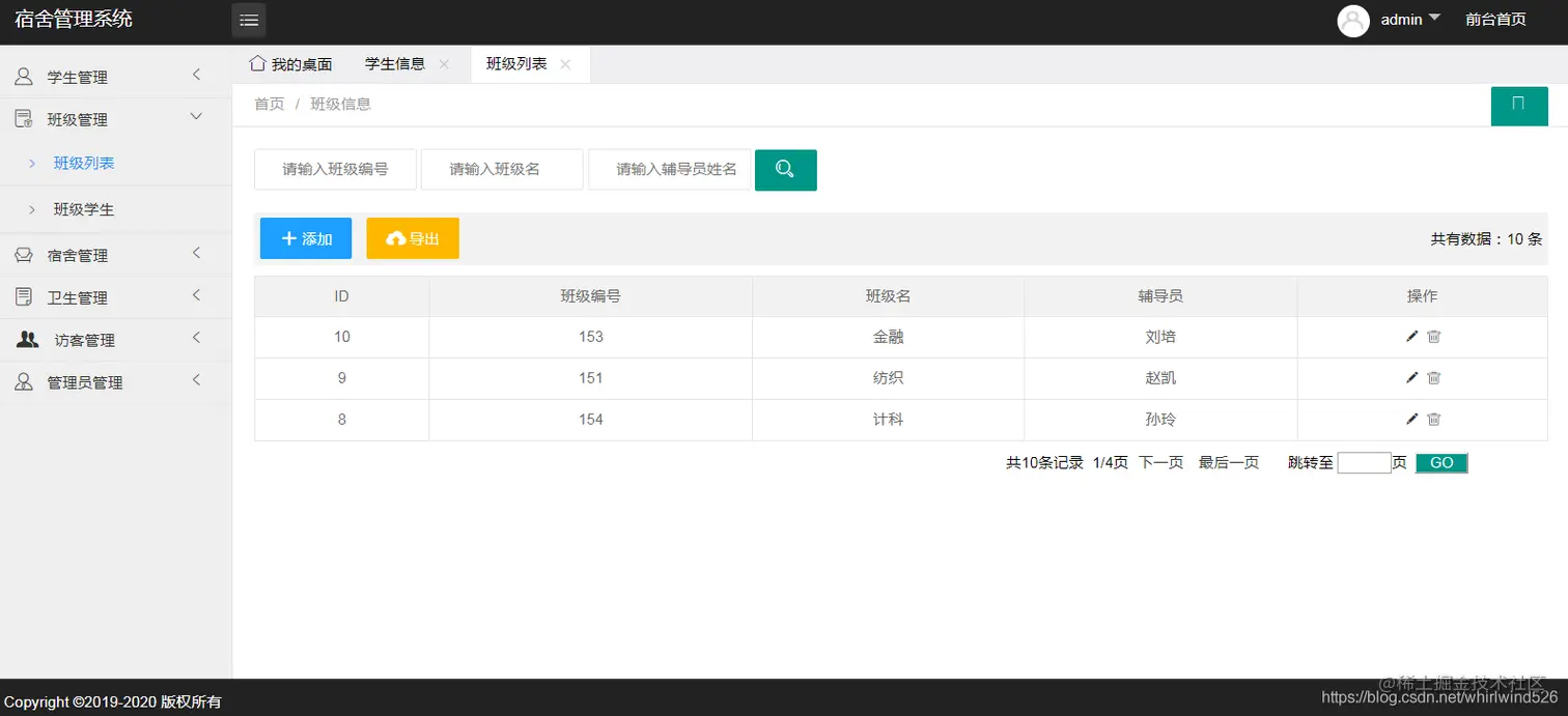基于SSM实现学校宿舍管理系统:主要包含学生管理、宿舍管理、班级管理、宿舍卫生管理、访客管理、收费管理、管理员管理等功能。并能导出各模块数据到EXCEL表中。
