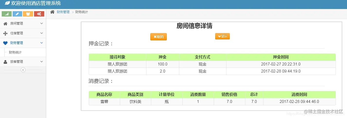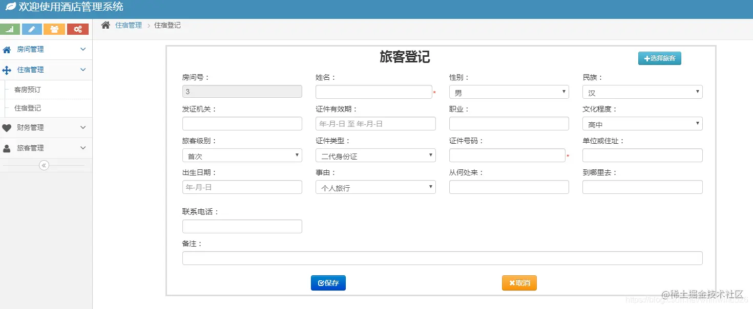 酒店管理系统是一种B/S架构的会员服务平台系统。包括房间管理、会员管理、住宿管理、财务管理、旅客管理等模块。