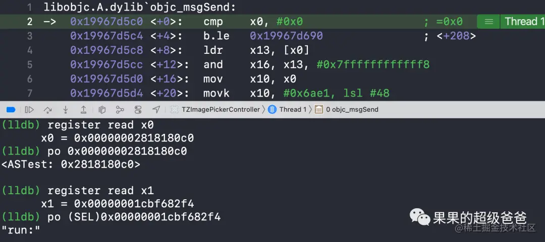 首先在方法出打一个断点,然后在设置一个objc_msgSend的符号断点,然后读取寄存器的值确认,就可以得到如下结果。