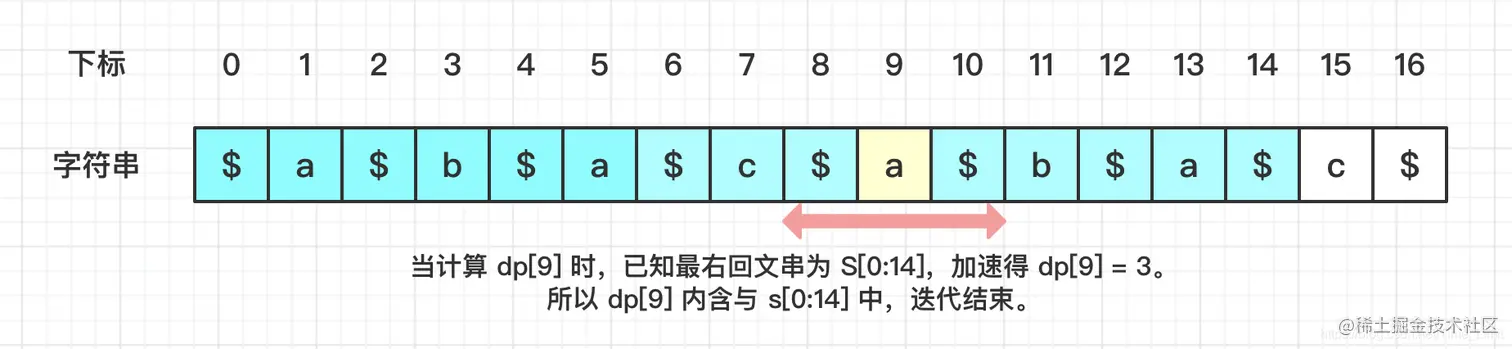 接下来,尝试证明一下Manacher算法的时间复杂度。 当开始计算 dp[i] 时: