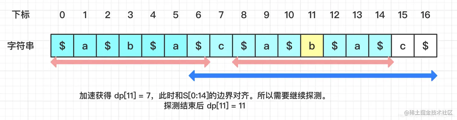当要计算 dp[11] 时,如按中心枚举法,需从 1 开始探测。但马拉车加速后,可以直接从 7 开始: