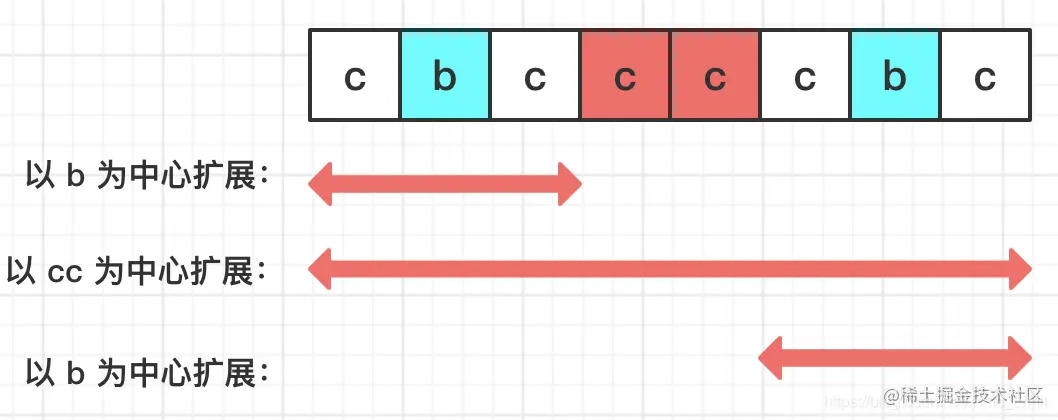 需要注意回文串的长度,如果是奇数的话,中心是一个字符,如果是偶数的话,中心是两个字符,比如上图中的"cc"就是最长字符的中心。