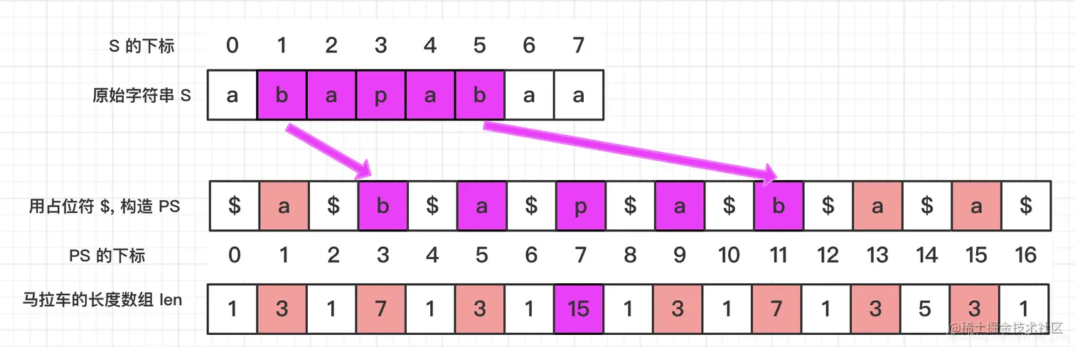 以 S[1:5] 为例,首选换算对应子串位置,得到 PS[3:11],找到PS[3:11]的中心 PS[7],通过查询长度数组 len,得知以 PS[7] 为中心的最长回文串的长度为 15。显然 PS[3:11] 及 S[1:5] 都是回文的。 偶数长度的字符串同样有效,比如 S[6:7],老铁们可自行验证~