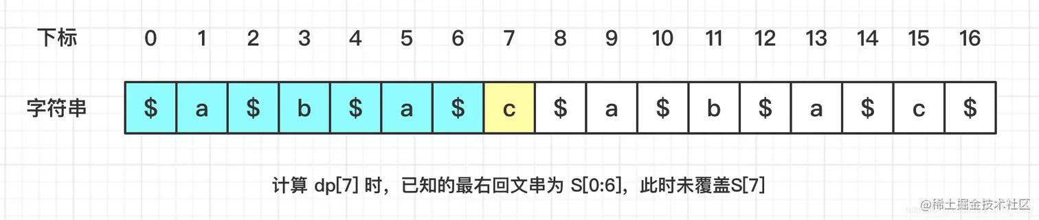 - 已知的最右回文串为 S[0:14],则 (14-11)*2+1 = 7。