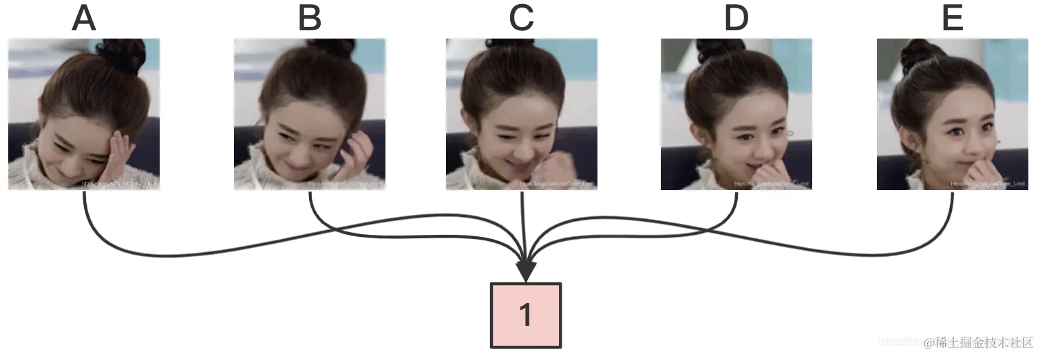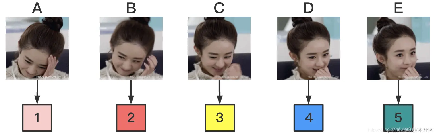 初始时,每张抓拍都构成了一个独立的集合。ABCDE代表图片的编号,12345代表集合的编号,箭头代表归属关系。
