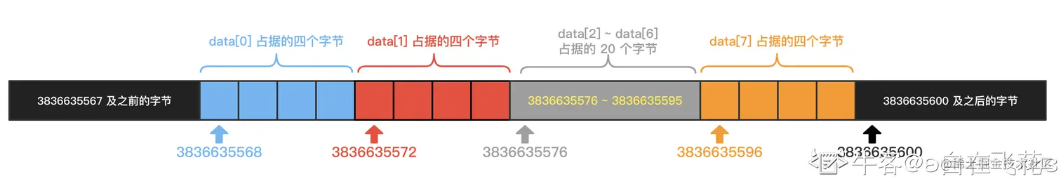 值得一提的是,首地址即data的地址每次执行时均可能发生变化(原因我们后续再讨论),但是相邻元素的地址的偏移量是不会变化的。偏移量为 4, 即存储一个 int32_t所需的字节数量。