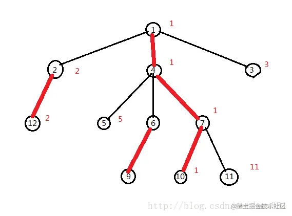 则dfs完成后 seg存储的内容为 { 1,4,7,10,11,6,9,5,2,12 , 3}。