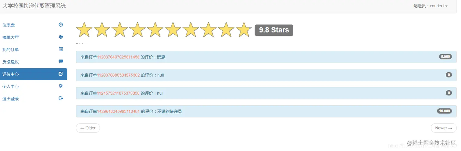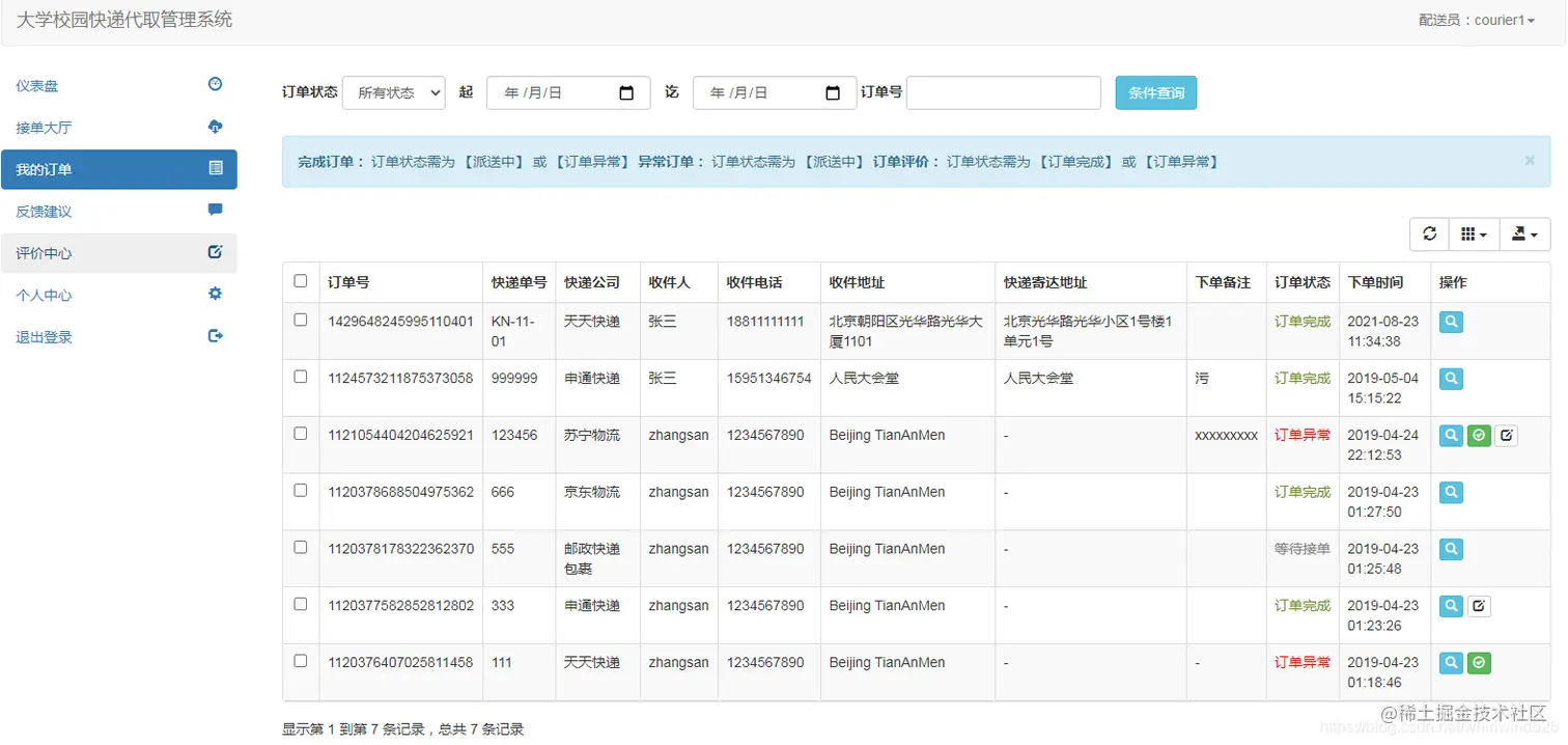 本项目主要实现了代取快递的信息管理功能,使用角色有三类:一是客户可以直接访问系统下单,输入代取快递的相关信息,并可以在系统中查询订单的完成进度,也可以对系统进行相应的反馈并查询反馈的回复情况。也可以直接在线支付代取费用。二是接单员,可以登陆系统进行接单,并根据自己的订单完成情况修改订单状态,查询自己的订单等。三是系统管理员,可以实现对人员和订单信息的管理,对反馈信息的回复等操作。