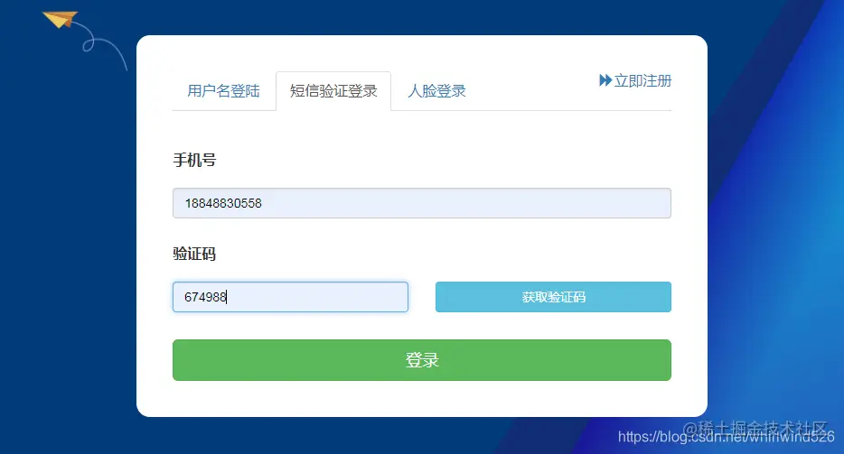 - 系统支持手机号登陆注册:通过调用阿里去或腾讯云接口完成短信的发送验证