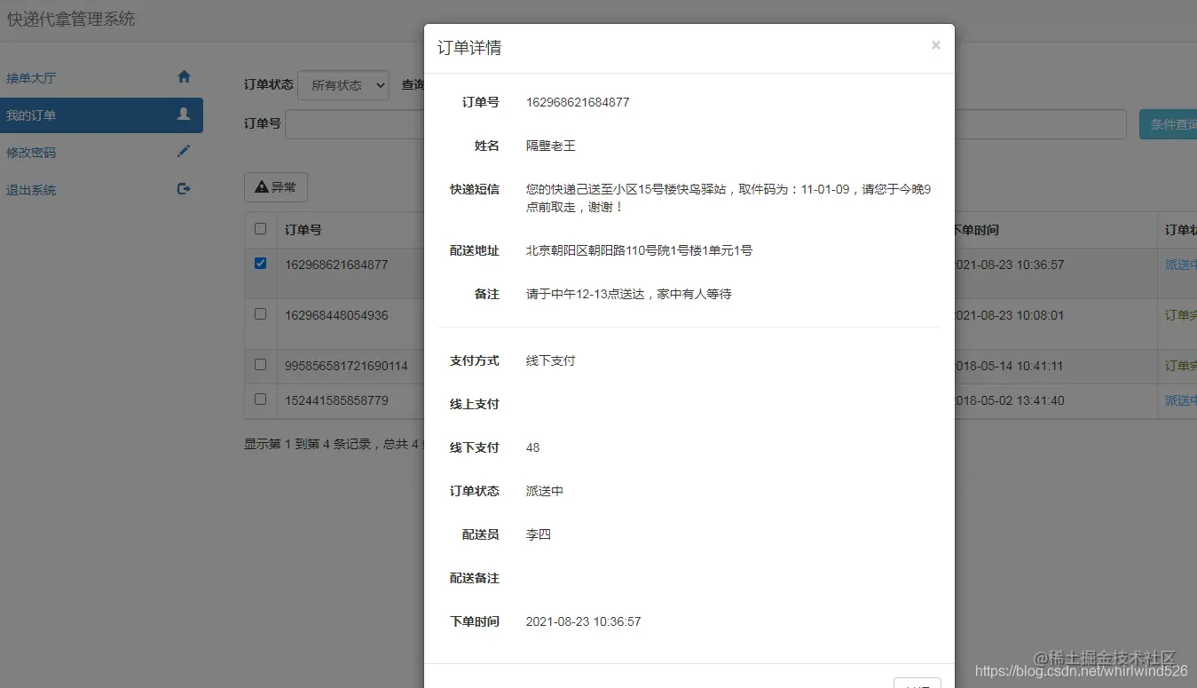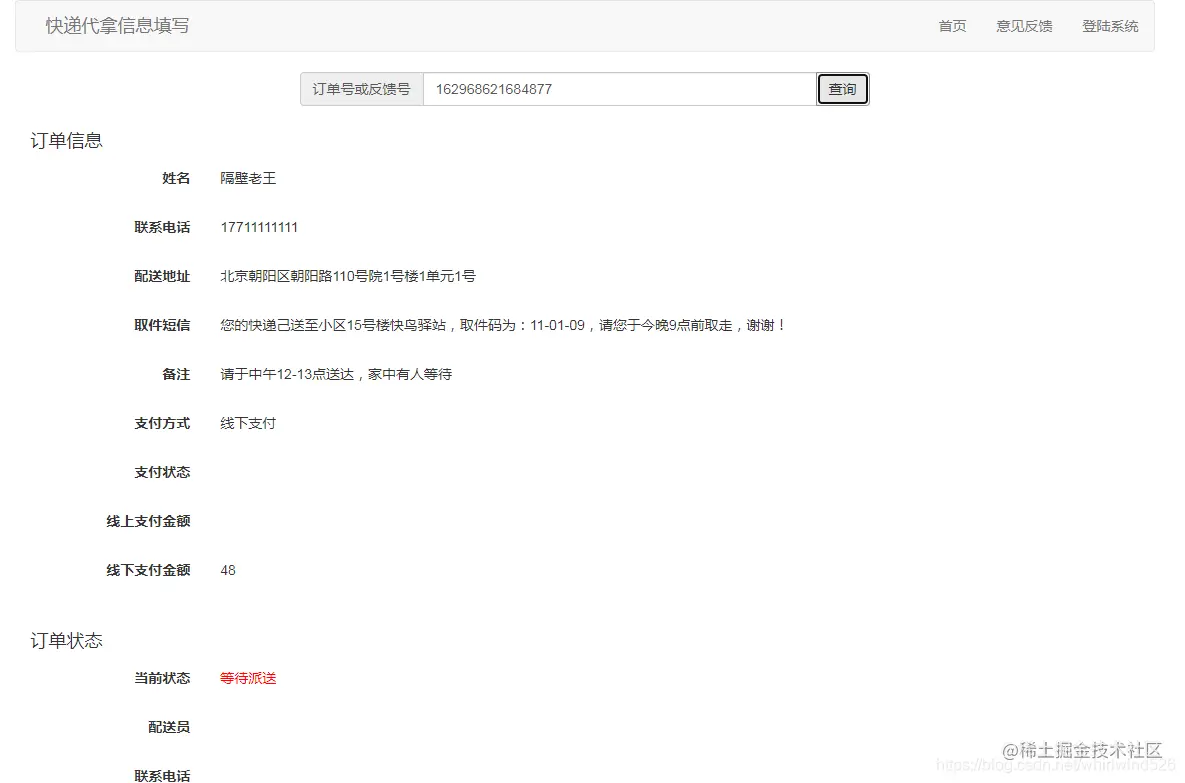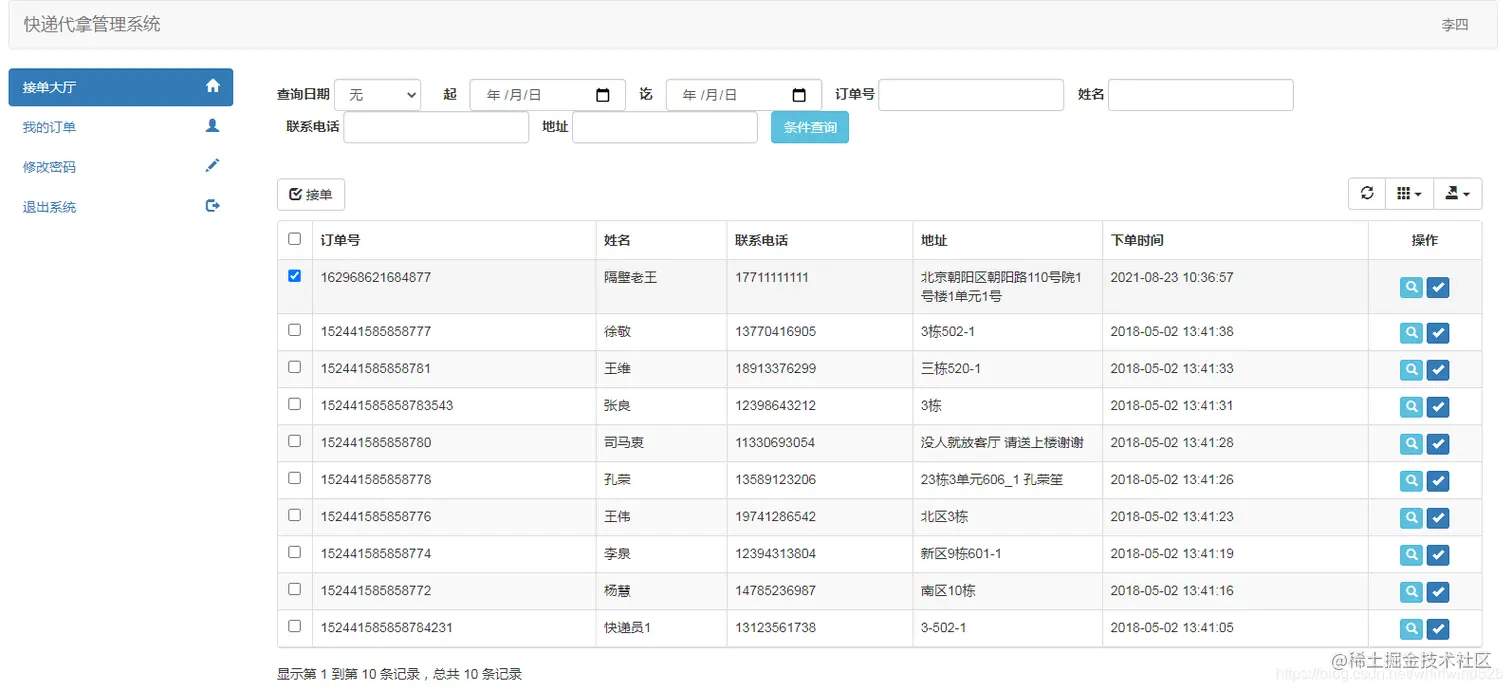 本项目主要实现了代取快递的信息管理功能,使用角色有三类:一是客户可以直接访问系统下单,输入代取快递的相关信息,并可以在系统中查询订单的完成进度,也可以对系统进行相应的反馈并查询反馈的回复情况。也可以直接在线支付代取费用。二是接单员,可以登陆系统进行接单,并根据自己的订单完成情况修改订单状态,查询自己的订单等。三是系统管理员,可以实现对人员和订单信息的管理,对反馈信息的回复等操作。