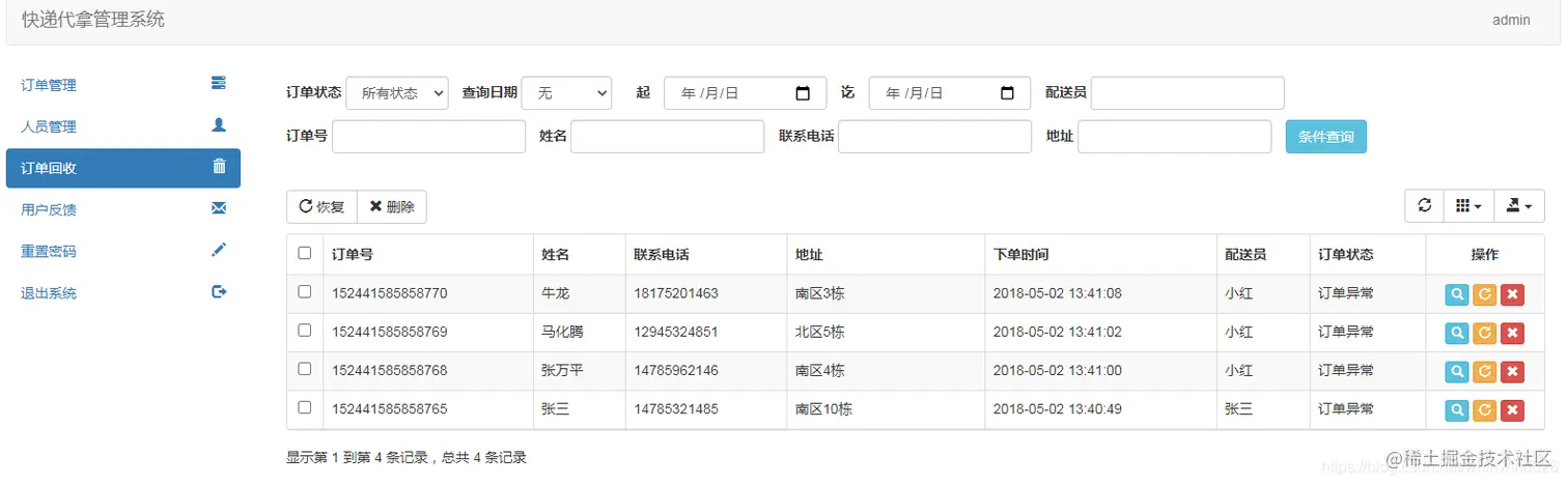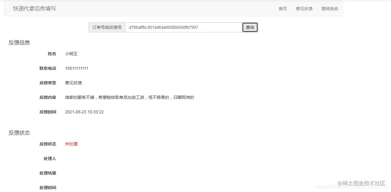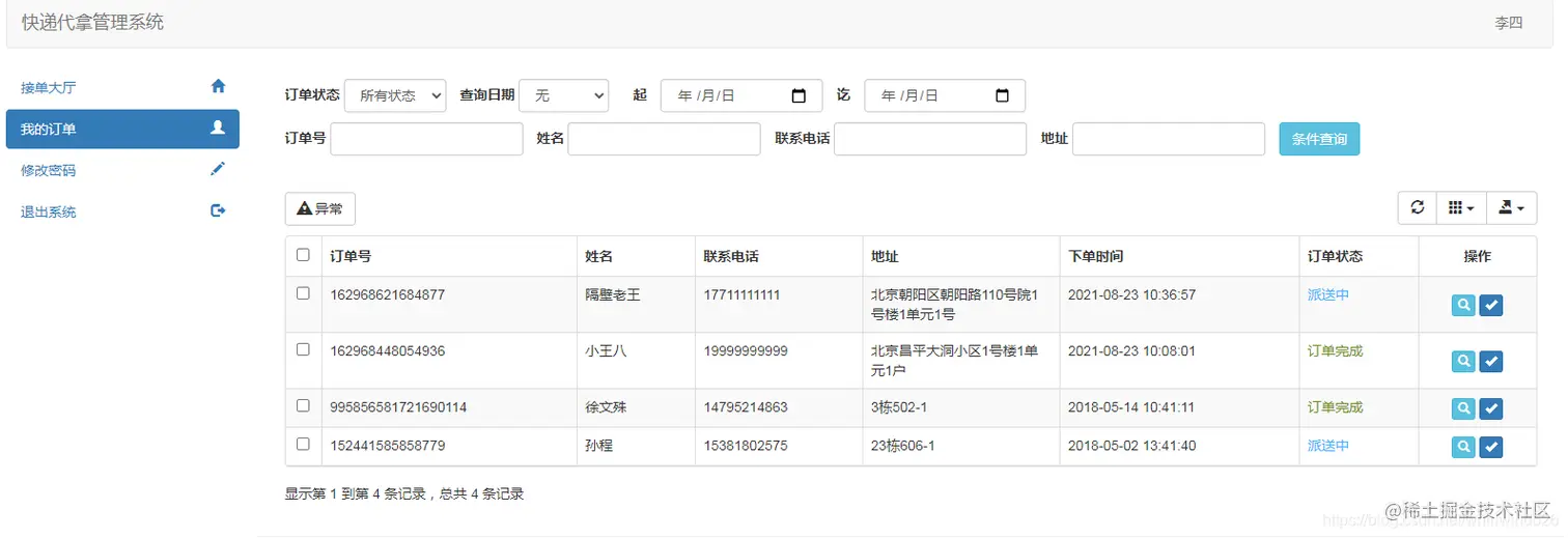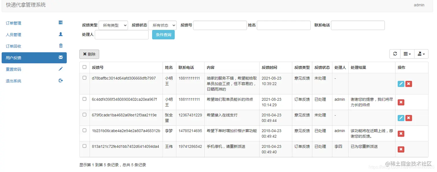 本项目主要实现了代取快递的信息管理功能,使用角色有三类:一是客户可以直接访问系统下单,输入代取快递的相关信息,并可以在系统中查询订单的完成进度,也可以对系统进行相应的反馈并查询反馈的回复情况。也可以直接在线支付代取费用。二是接单员,可以登陆系统进行接单,并根据自己的订单完成情况修改订单状态,查询自己的订单等。三是系统管理员,可以实现对人员和订单信息的管理,对反馈信息的回复等操作。
