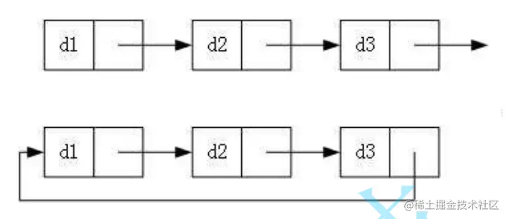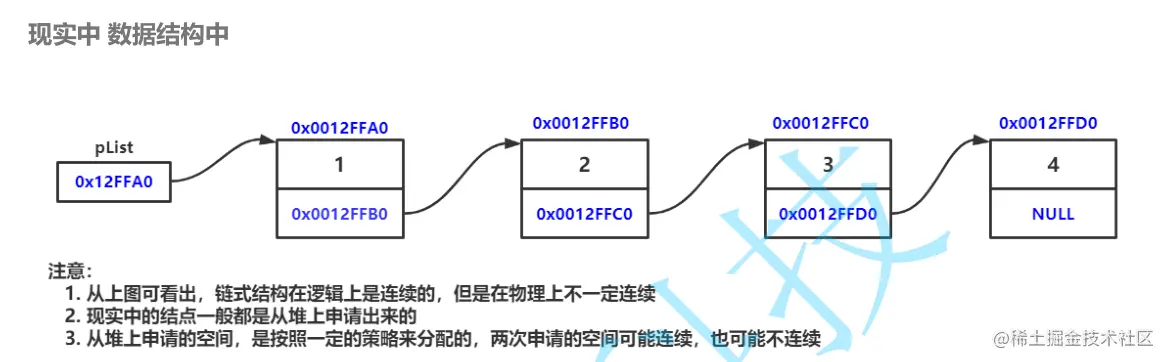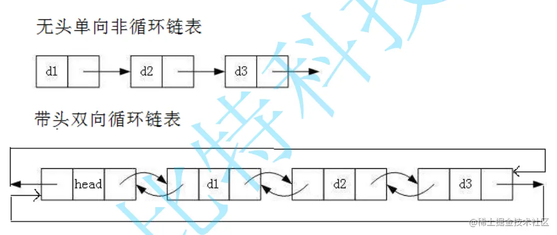 - 无头单向非循环链表:结构简单,一般不会单独用来存数据。实际中更多是作为其他数据结构的子结构,如哈希桶、图的邻接表等等。另外这种结构在笔试面试中出现很多。