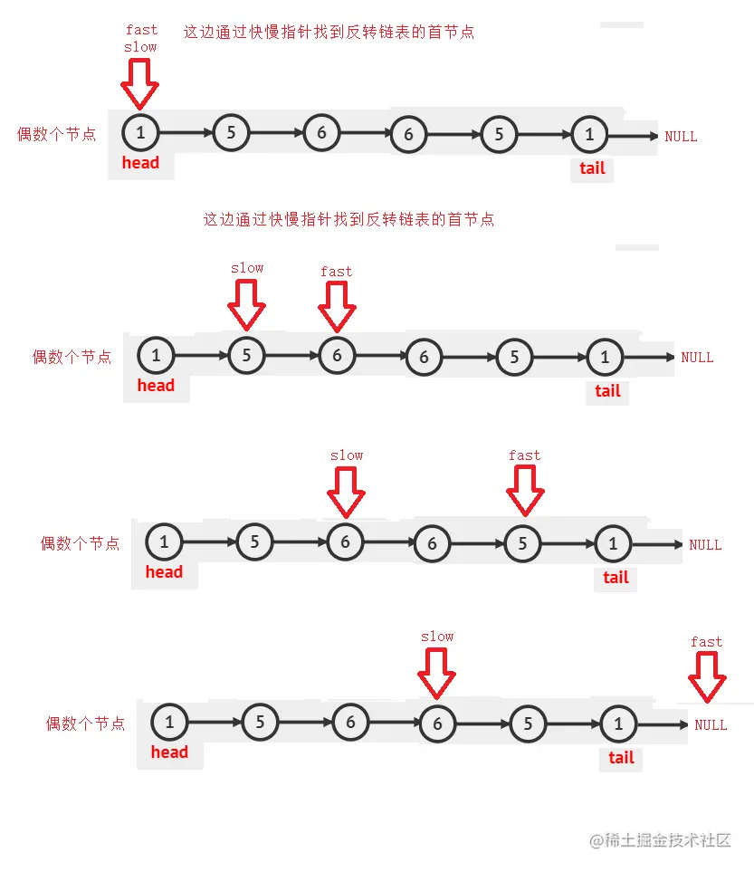 所以我们先找到反转链表的首节点,然后反转,再看看是否是回纹链表