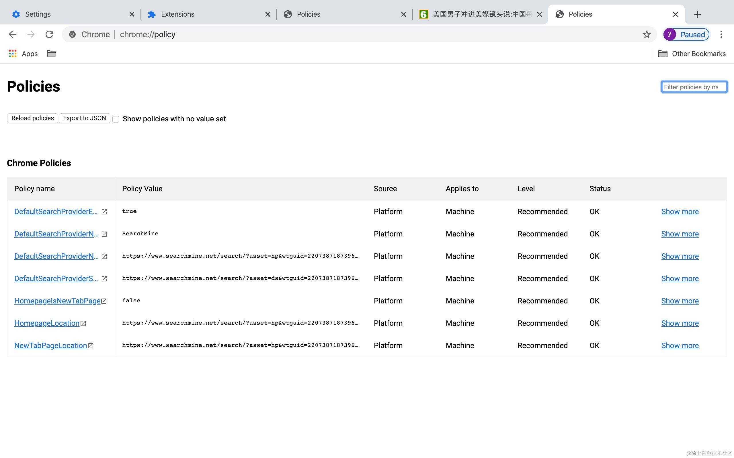 After that, restarting the computer and resetting the browser can usually solve the above problems! The resolved chrome: // policy / is displayed as follows: