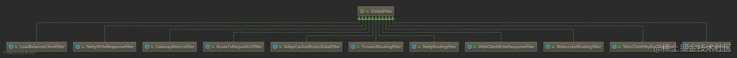 全局过滤器在系统初始化时就作用于所有的路由,不需要单独去配置。全局过滤器的接口定义类是GlobalFilter,Gateway本身也有很多内置的过滤器,我们打开类图看看: