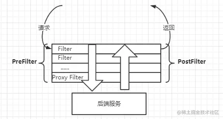 从图中很明显可以看出,在请求后端服务前后都需要经过Filter,于是乎Filter的作用就明确了,在PreFilter(请求前处理)可以做参数校验、流量监控、日志记录、修改请求内容等等,在PostFilter(请求后处理)可以做响应内容修改。
