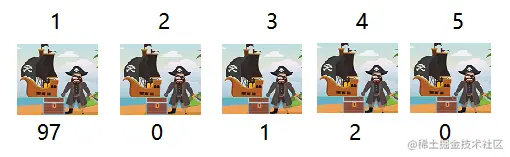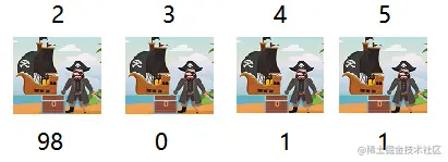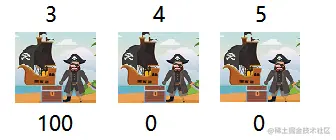当五个海盗都存在时,这时候需要1号来分金币了。在第3步的设想中我们可以知道3号一个金币都没有,所以1号可以给3号一枚金币拉拢3号同意。然后4号和5号在第3步设想中都能获取一枚金币,所以1号可以给4号或者5号2枚金币拉拢其中一人同意该方案;这样就有一半以上的人数同意该方案了。所以最终5个海盗所分得金币情况如下图所示: