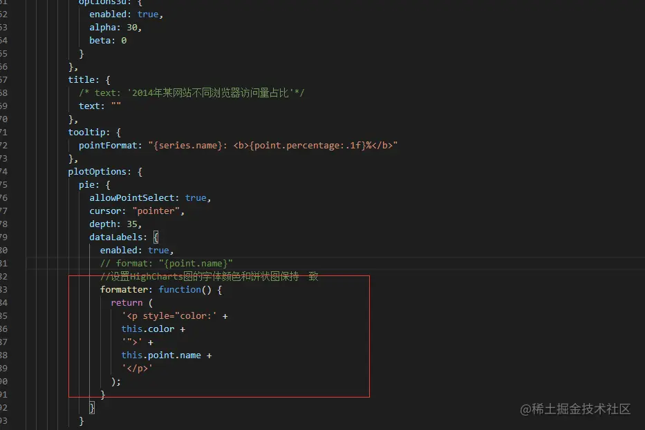 之前一直用的百度的Echarts但是他没有3D的饼图所以今天用到HighCharts中的3D饼图,但是发现,饼图的数据标签颜色属性中的color是string类型,而不是array类型的,说明无法跟随饼图的颜色来进行着色,这就很坑了,在网上找了很多的解决方法,都是在formatter属性中打主意,而且是通过判断数据名称来进行着色,但是这样便无法动态进行数据的更替了,当我在formatter中打印出this的时候发现里面有color的属性,对应了每个饼图的颜色,这样我们就不需要通过判断来分别给数据标签着色了。