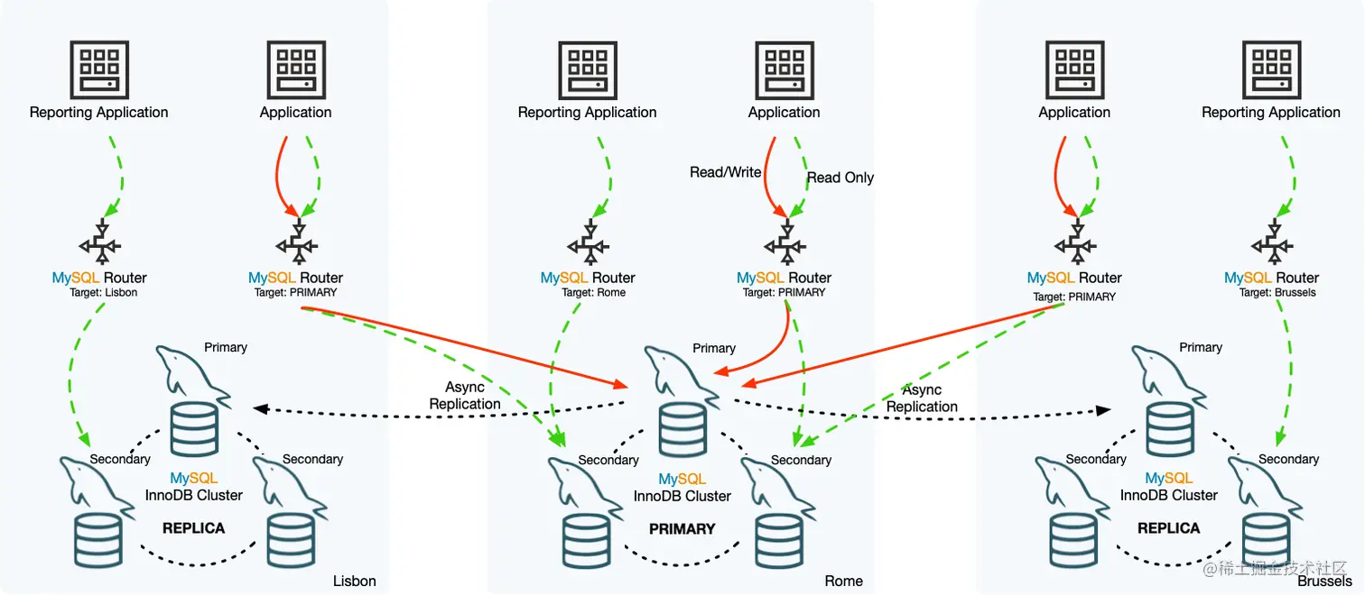 Group Replication技术确保复制始终在主集群的主服务器(作为发送方)和副本集群的主服务器(作为接收方)之间进行。 InnoDB ClusterSet优先考虑可用性而不是数据一致性,以最大限度地提高容灾能力。- 每个单独的
