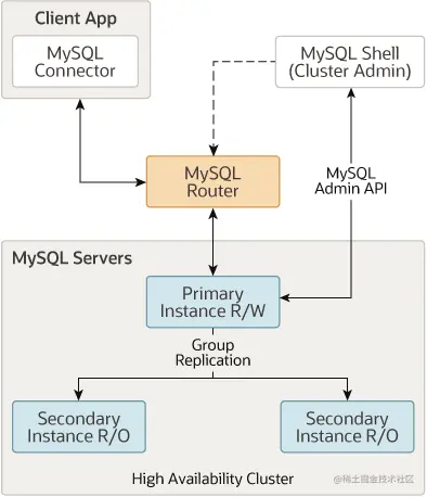 InnoDB ReplicaSet, 官方推荐尽可能部署InnoDB集群(InnoDB Cluster), 可部署为一主多从或者多主多从结构, 组复制(Group Replication)技术保障了各节点的高可用性和一致性. - InnoDB集群副本集(