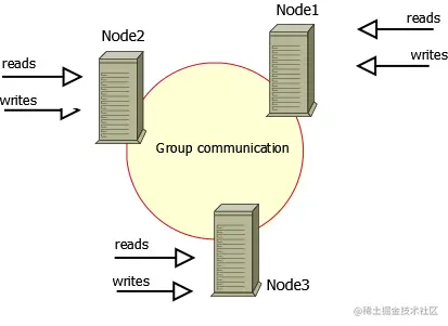 - 没有中央管理。每个节点之间同步复制相同的数据集, 某一节点不可用时, 集群将继续运行而不会丢失任何数据