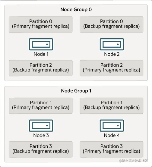 Partition), 一个分区保存至少一个片段副本(Fragment Replica).节点组的数量 = 节点数 / 片段副本数 [# of node groups] = [# of data nodes] / NoOfReplicas 分区数 = 节点数 / LDM线程数 [# of partitions] = [# of data nodes] * [# of LDM threads]四个节点、两个片段副本、单线程(ndb)的存储结构如下: