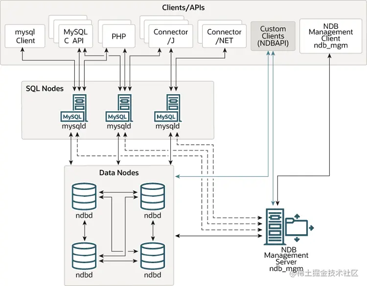 MySQL InnoDB ClusterSet)进一步提供了集群的容灾能力, 这种"集群的集群"主要用于大型企业不同数据中心的数据备份. - NDB集群(