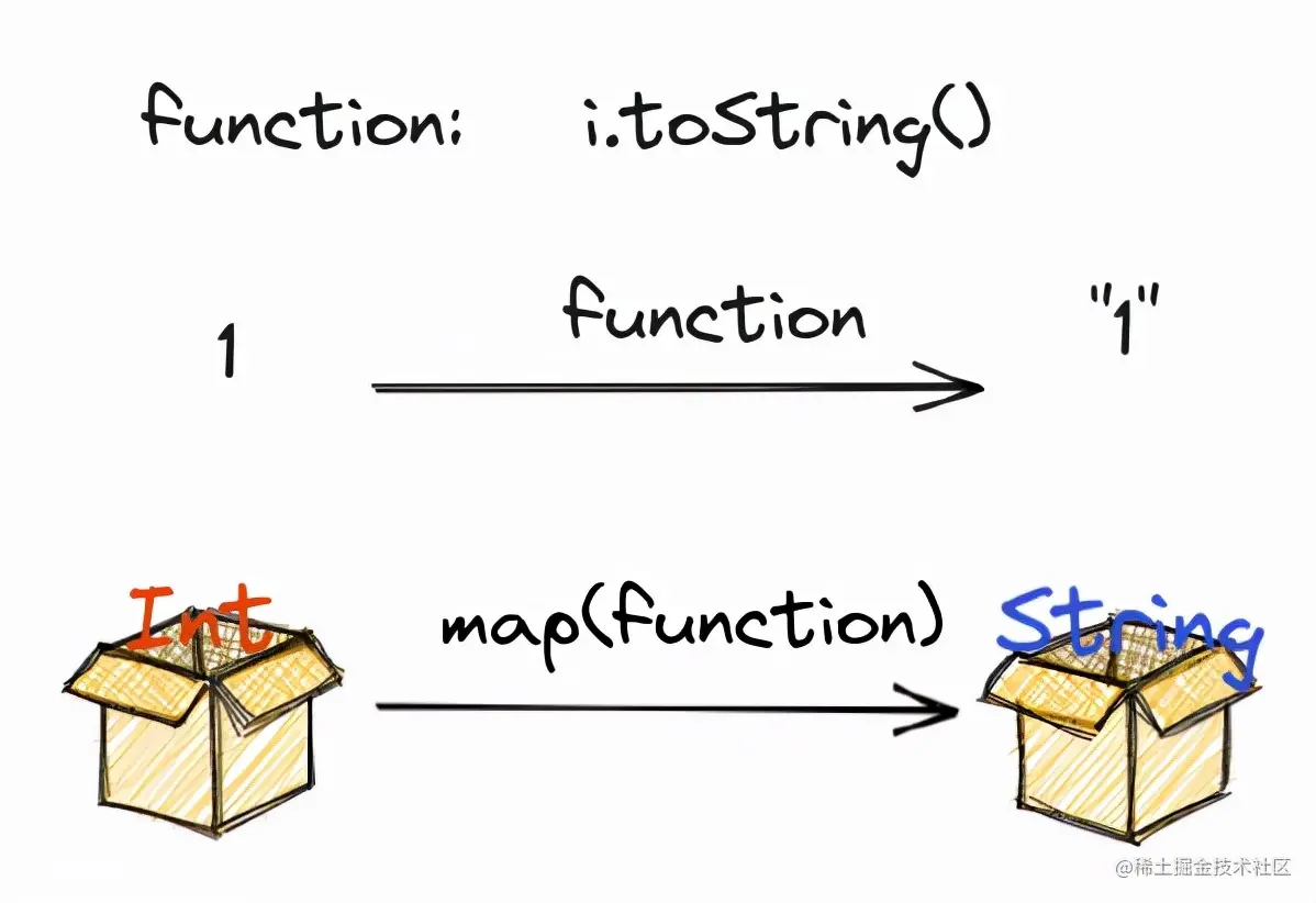 函子运算可以将一个 T 映射到 S 的 function 应用到 Box< T> 上,让其成为 Box< S>,一个将 Box 中的数字转换为字符串的例子如下: