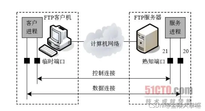 既然上面提到了FTP传输数据时建立了两条连接,那么就意味着起码要有两组进程来为之服务。这两组进程分别是属于用户和服务器的控制信息进程和数据进程,两组进程形成了两条连接。控制连接不能完成传输数据的任务,只能用来传送FTP执行的内部命令以及命令的响应等控制信息;数据连接是服务器与客户端之间传输文件的连接,重点是当数据传输完成后,数据连接会撤消,再回到FTP会话状态,直到控制连接被撤消,并退出会话为止,在整个交互的 FTP 会话中,控制连接始终是处于连接状态的,数据连接则在每一次文件传送时先打开后关闭。