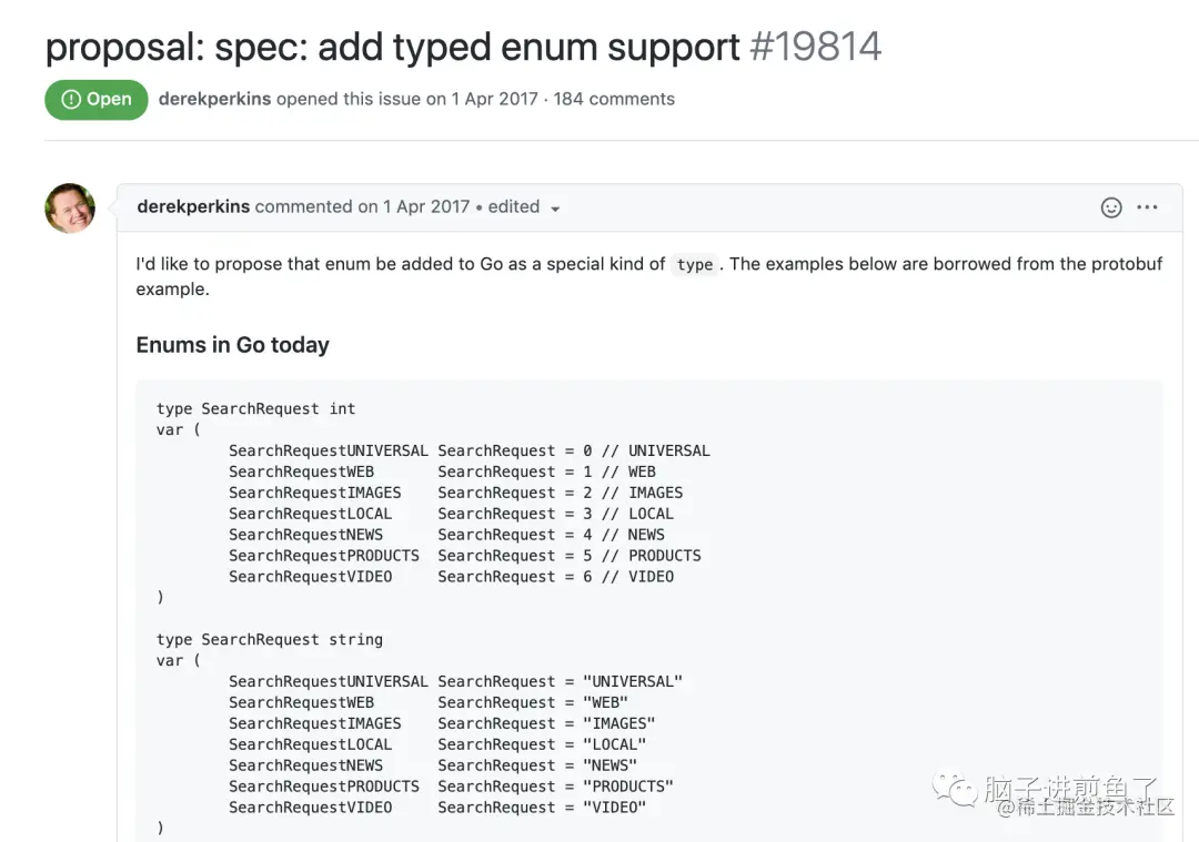 也有小伙伴已经在社区中提出了 ”proposal: spec: add typed enum support“ 的提案,相信未来有机会能看到 Go 自身支持 enum(枚举)的那一天。