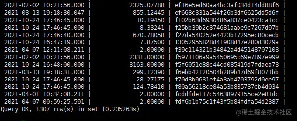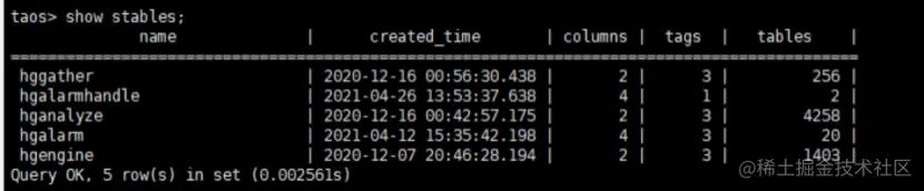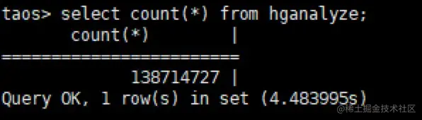 对超级表 hgengine 查询所有设备的最新状态值,TDengine 的耗时是 0.23s。这里不得不提一下,由于我们是 2.0.7 的旧版本,距今已经 1 年之久,很多函数都没有缓存之类的优化,所以性能和新版差距很大。但是由于项目稳定运行很久了,所以就一直都没有升级到最新版本体验,十分遗憾。