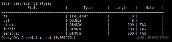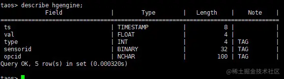 首先我们根据业务类型,创建了 5 张超级表,数据量比较大的两张表结构如下: