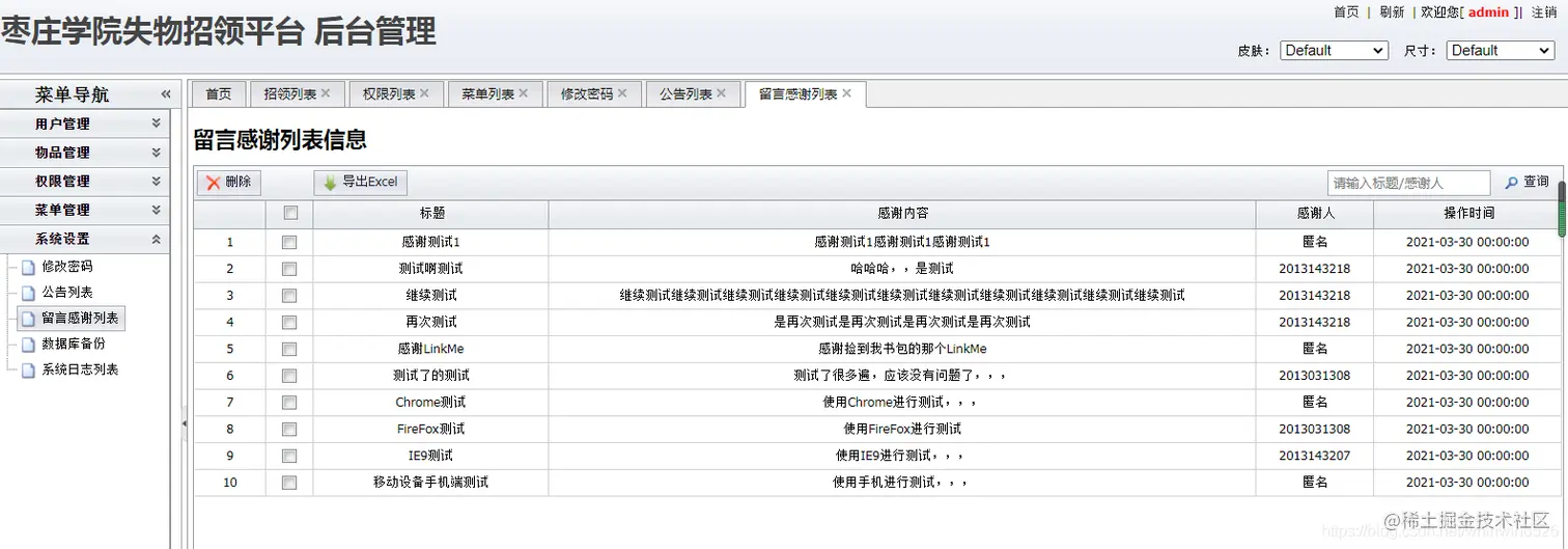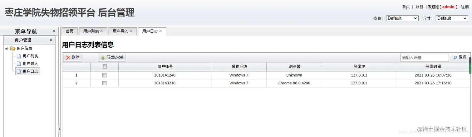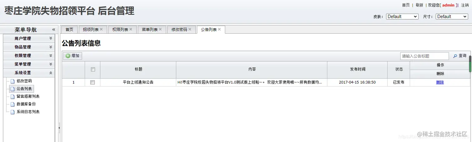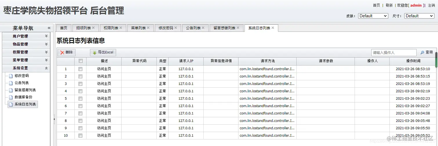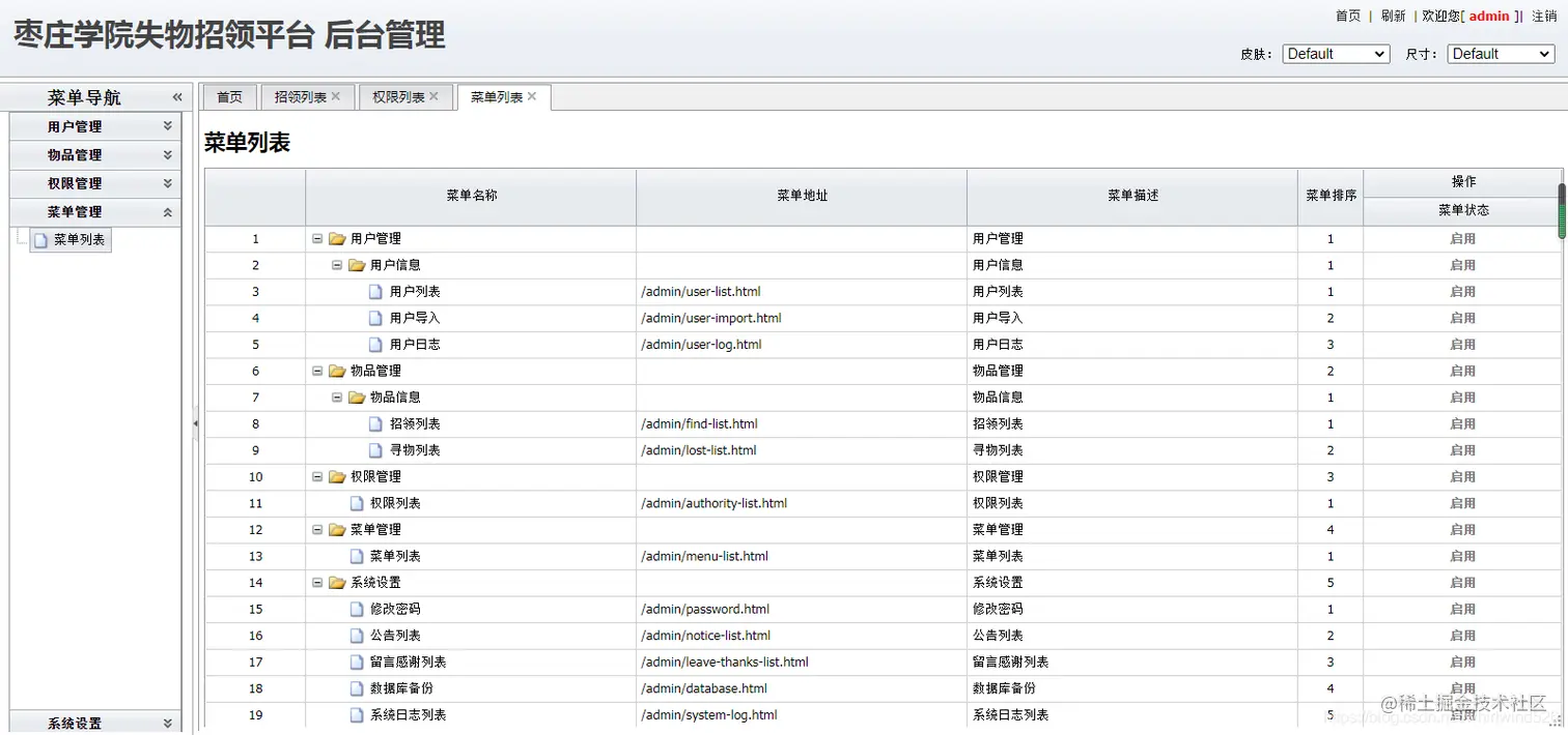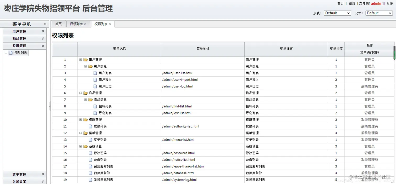 后台系统管理员用户:主要实现在后台管理用户信息、物品信息、招领信息、寻物信息、权限管理、日志管理、功能菜单信息等功能。在user表中state为3.
