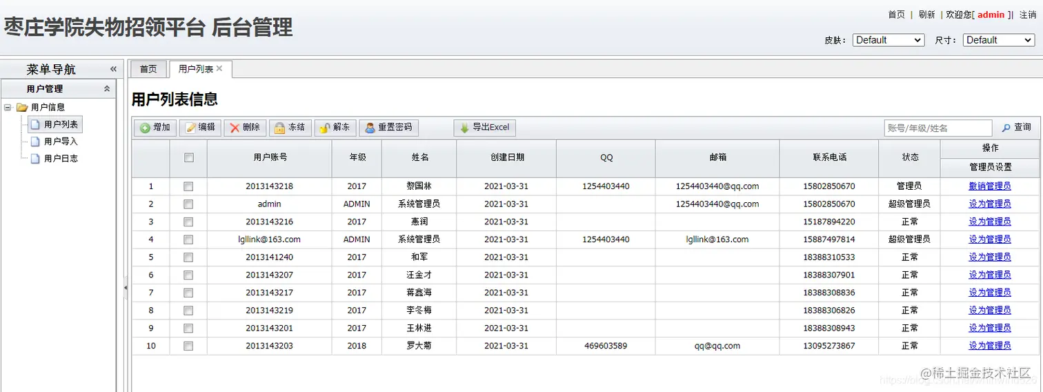 后台管理员用户:主要实现在后台管理用户信息、物品信息、招领信息、寻物信息、系统设置等功能。在user表中state为2.