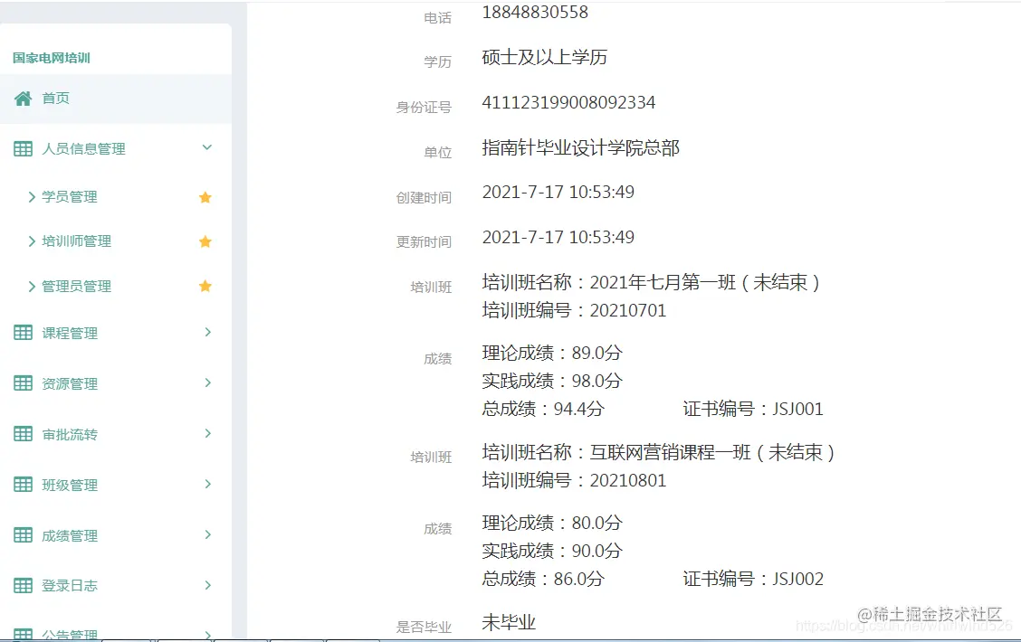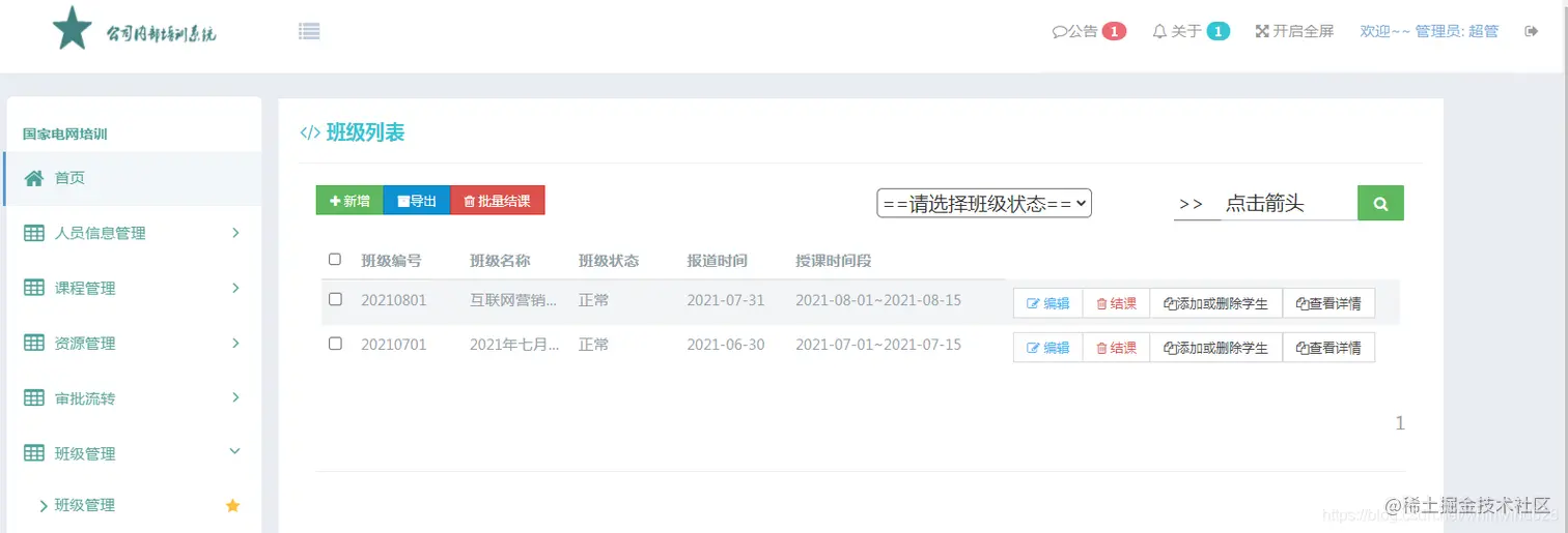 班级管理模块主要实现班级的增删改查以及导入导出的相关操作。培训结束可以实现结课操作。可以在班级中选择添加学生信息。查看班级详情等