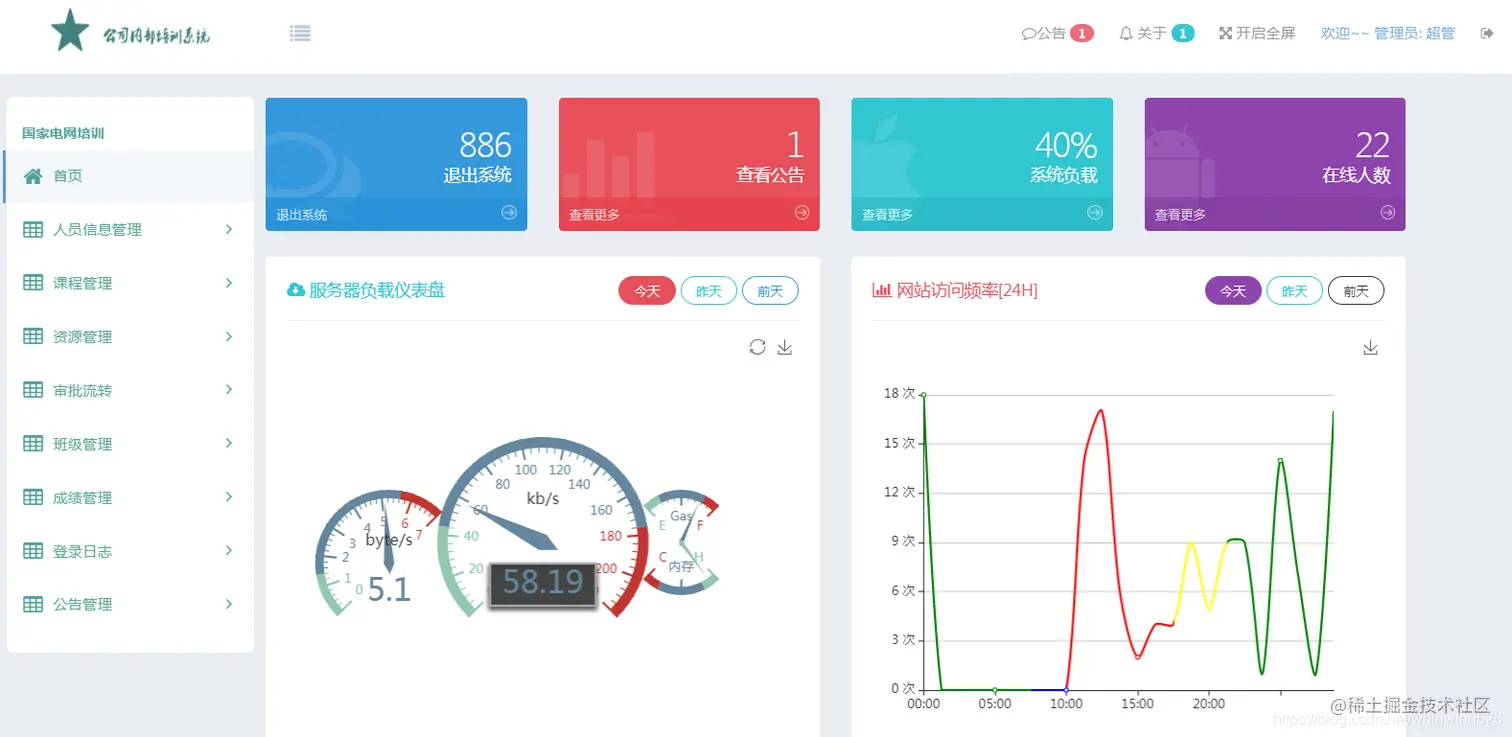 主界面左边是系统的功能菜单,右边主界面展示系统的仪表盘数据统计信息,采用Echarts 进行图形报表处理显示