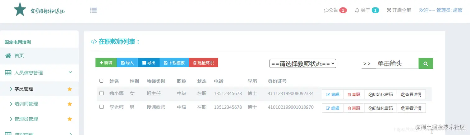 培训师管理模块主要可以实现培训师信息的添加、编辑、查询,导入导出,离职,恢复入职,初始化密码的相关操作,并可查看培训师的详情信息