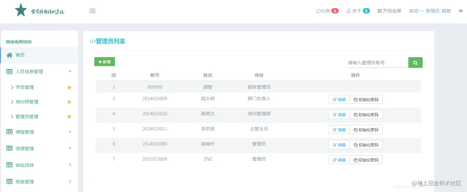管理员管理主要实现对管理员信息的添加编辑和初始化密码操作