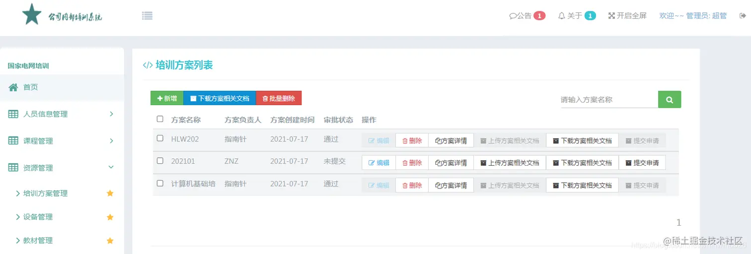 培训方案管理模块主要实现方案的新增、编辑、删除,上传方案文档,下载方案文档,提交方案。己审批过的方案不能编辑和删除。