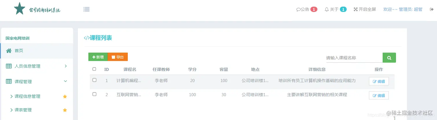 课程信息管理主要实现课程信息的添加、编辑、搜索,导出操作