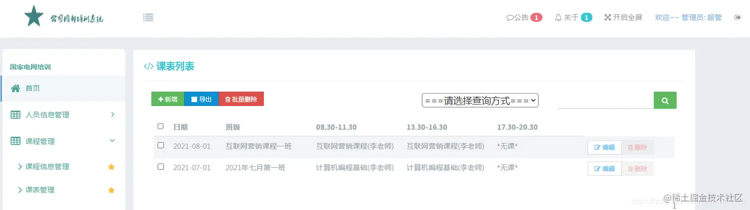 课表管理主要实现课程课表信息的新增、编辑、删除、查询、搜索、批量删除、导出的相关功能