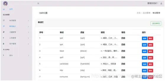 管理员登陆系统后可以实现单词管理、单词记忆统计、书籍管理、公告管理、用户管理等功能。